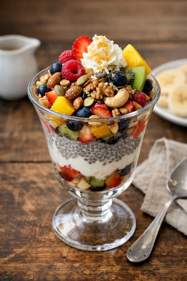 奇亞籽泡植物奶形成布丁狀,層層堆疊水果與堅果,打造「健康版聖代」。